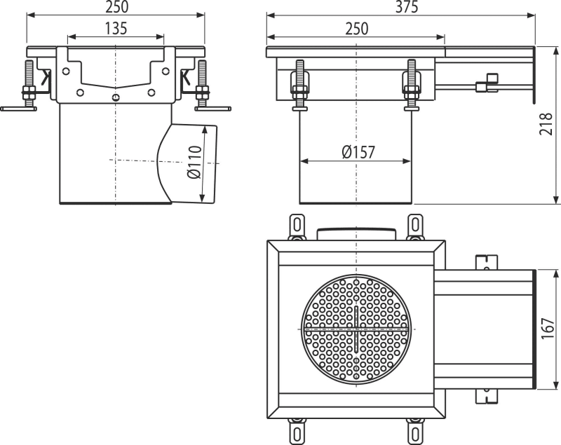 Industrijski točkasti slivnik sa ulazom 250×250-135, inox AISI 304