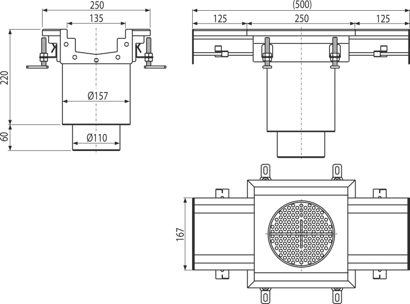 Industrijski točkasti slivnik sa ulazima 250×250-135, inox AISI 304