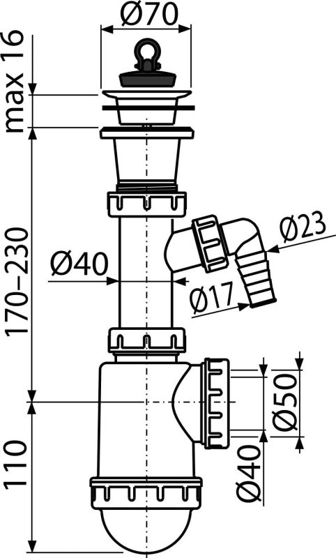 - Odvod pripremljen za spajanje odvodne cijevi Ø50 ili Ø40 mm