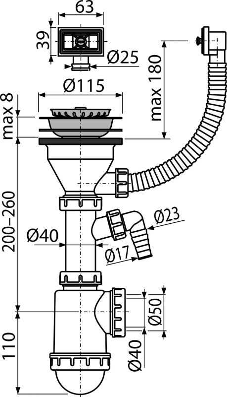 - Odvod pripremljen za spajanje odvodne cijevi Ø50 ili Ø40 mm