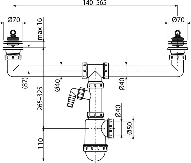 Sifon za sudoper sa duplim koritom s inox mrežicama DN70 i priključkom