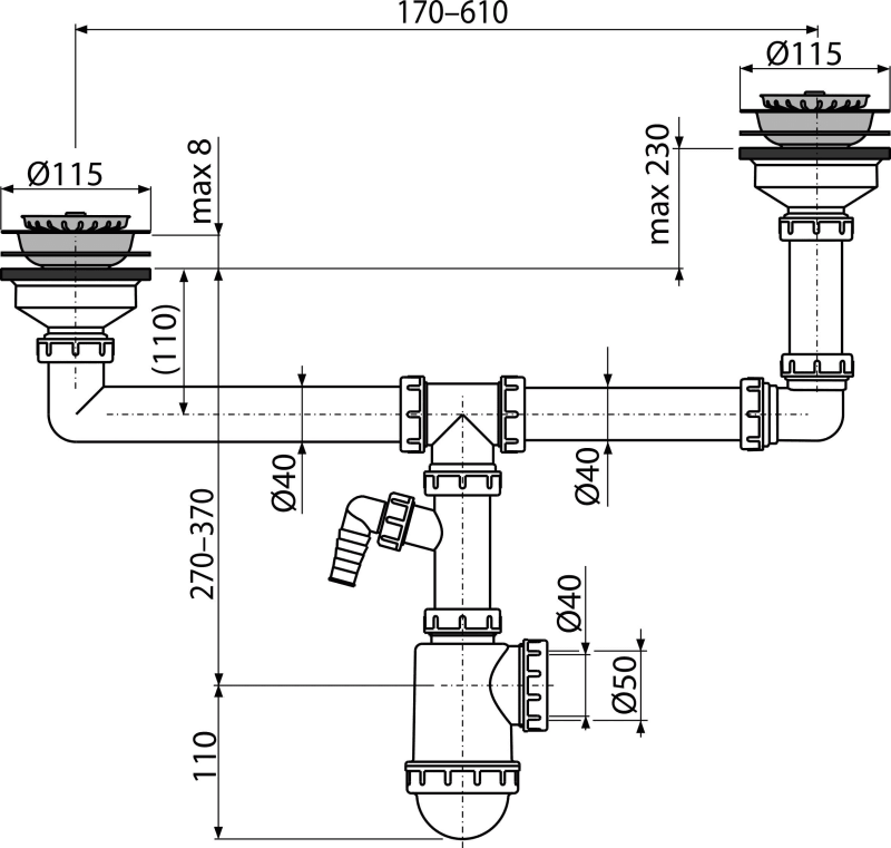 Sifon za dupli sudoper sa nehrđajućim mrežicama DN115 za dvije razine i priključkom