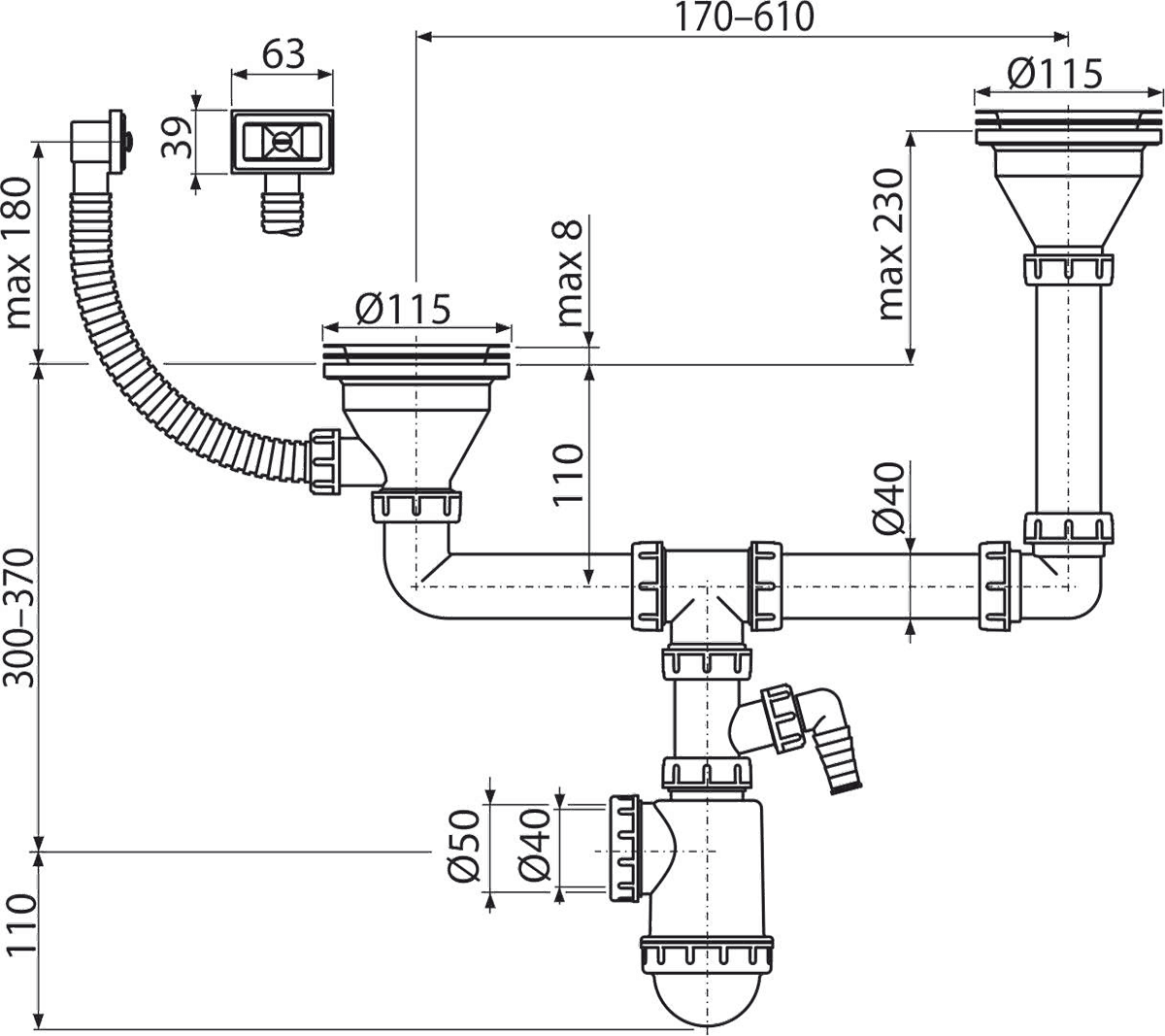 Sifon za dupli sudoper sa nehrđajućim mrežicama DN115 za dvije razine i priključkom, s preljevom