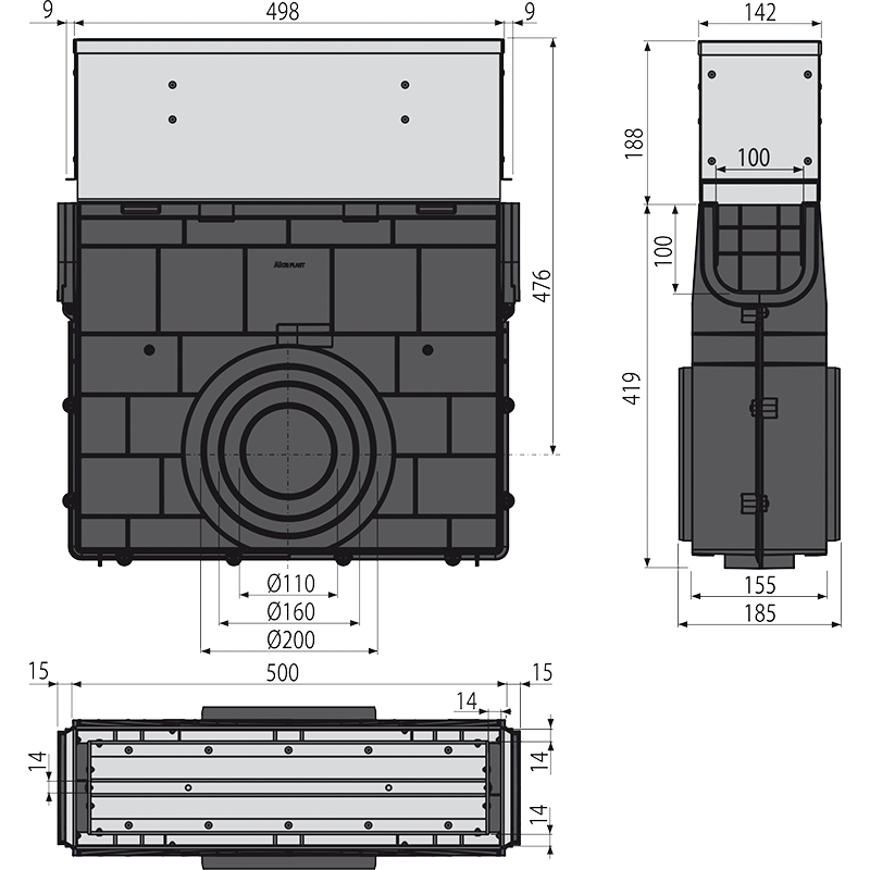 Slivnik za vanjsku tuš kanalicu sa otvorima i simetrijskim revizijskim umetkom 160 mm, nehrđajući