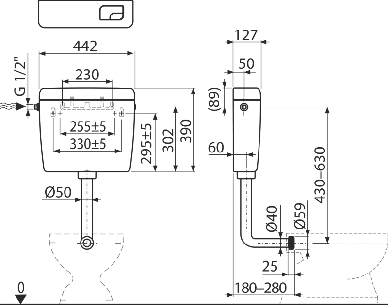 Kada se instalira na visoko postavljeni vodokotlić, funkcionalno je samo veliko ispiranje6 – 8 l